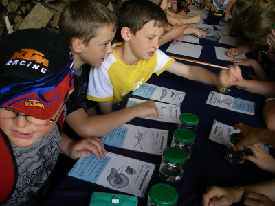 Die vom Wasserland-Team betreute Station "Wasser und Tiere" hatte für die Kinder ein sog. "Becherlupenspiel" und eine Zeichenstation, in der die Kinder ihre Phantasie bezüglich des Aussehens der Wassertiere spielen lassen konnten, vorbereitet. Trotz des eher mäßigen Wetters - es gab nur zwei wirkliche Sonnentage - waren die Kinder mit Freude und Eifer bei der Sache.