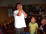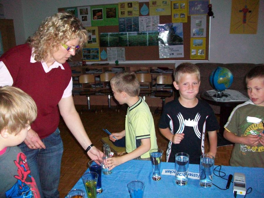 Die zweite Gruppe begann, durch riechen, schmecken, hören, tasten und sehen Wasser besser kennen zu lernen. "Wasser mit allen Sinnen" hieß die Station und die Kinder bekamen die Aufgabe zu raten, wie z.B. gelbes, rotes oder grünes Wasser schmeckt. Danach durften sie diese Wasser kosten und stellten fest, dass es anders schmeckte als sie dachten.