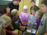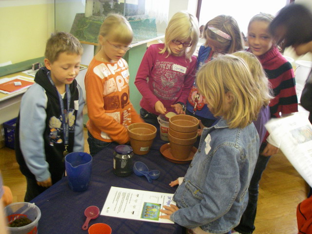 Spannung machte sich beim Testen der selbst gebauten Kläranlage breit. Und siehe da, das ursprünglich stark verunreinigte Wasser trat nach der Passage der unterschiedlichen Filterschichten wieder klar und sauber zu Tage. Zum Abschluss dieses Themenkreises bastelte jedes Kind seine eigene Quelle, um diese im Schulhof zu testen.
