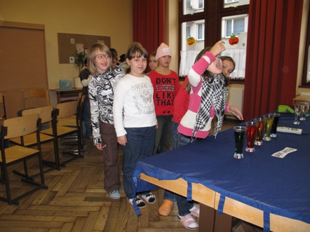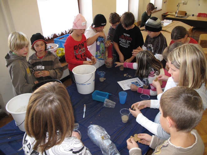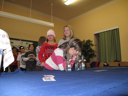 Mit großer Aufmerksamkeit verkosteten die Kinder verschiedene Trinkwasserqualitäten, wobei die meisten klar destilliertes (Regen-)wasser von Mineral- bzw. Leitungswasser unterscheiden konnten. Als nächstes waren Wasserproben zu schmecken, die mit den Augen schon unterschieden waren.