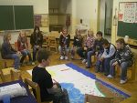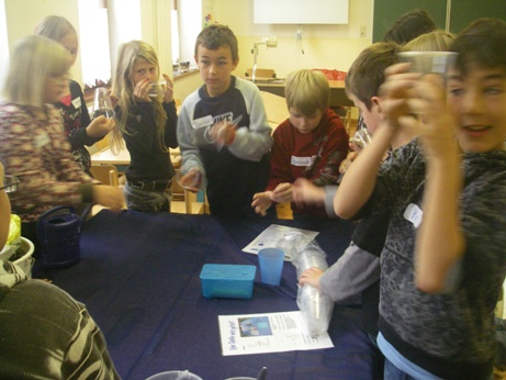 Das Wasserlandteam bestehend aus Christian und Johann führte mit der 4b einen Wassererlebnistag durch. Nach der Begrüßung wurden zwei Gruppen gebildet, die im Wechsel die beiden Module „Wasserkreislauf" und „Wasser mit allen Sinnen" durchgingen. Mit Unterstützung nur einer Lehrkraft war es nicht immer leicht, den Bewegungsdrang der ‚aufgeweckten' Kinder auf das Wassererlebnis zu lenken.