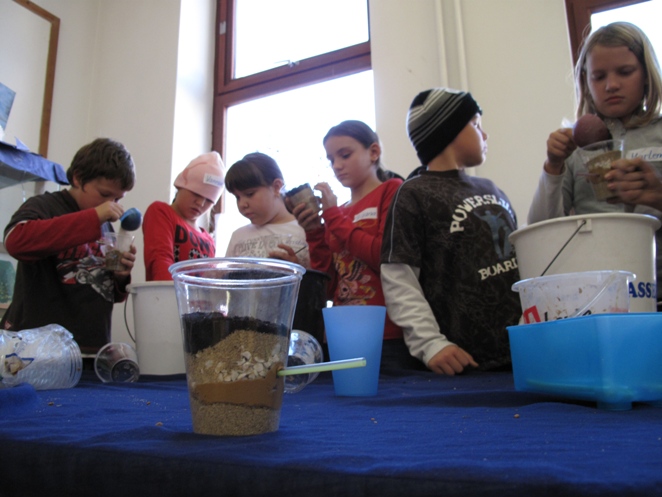 Regen versickert unterschiedlich schnell in verschiedenen Bodenarten. Im Experiment wurde unmittelbar einsichtig, dass z.B.Kies und auch Sand wegen der großen Zwischenräume kaum Wasser festhalten, dagegen Lehm eine praktisch undurchlässige Schicht bildet. Bemerkenswert verhielt sich die Gartenerde, die eine nicht geringe Wassermenge schwammartig aufsaugen konnte.