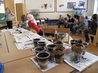 Die Erfahrungen aus dem Versickerungsexperiment - Kies und Sand lassen Wasser hindurch wie ein Sieb, Lehm dagegen dichtet ab - bauten wir es zunächst zu einer Minikläranlage aus; dann baute jedes Kind seine kleine Modellquelle:
