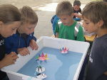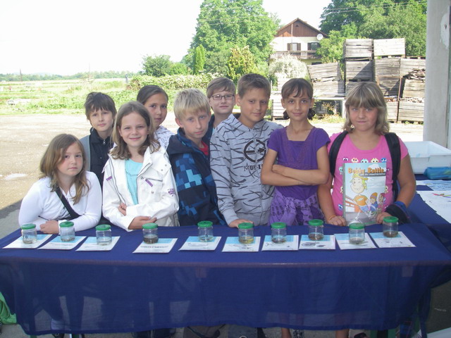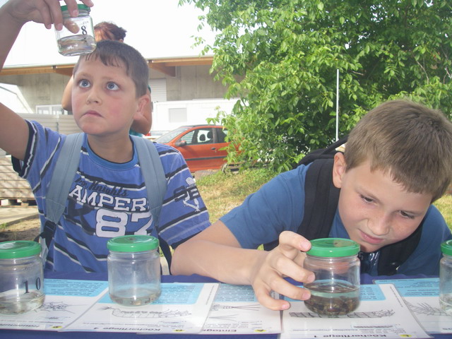 Am Wasserlandstand hörten die Kinder viel Neues und zum Teil bereits Bekanntes über das Leben im Wasser. Beim Becherlupenspiel bestand ihre Aufgabe darin, einige Wassertiere den jeweils dazugehörigen Schaukarten zuzuordnen. Um diese Zuordnung treffen zu können, war es notwendig, sich vor allem die unterschiedlichen Fliegenlarven genau anzusehen, um ihre oft nur geringen Unterscheidungsmerkmale zu erkennen.